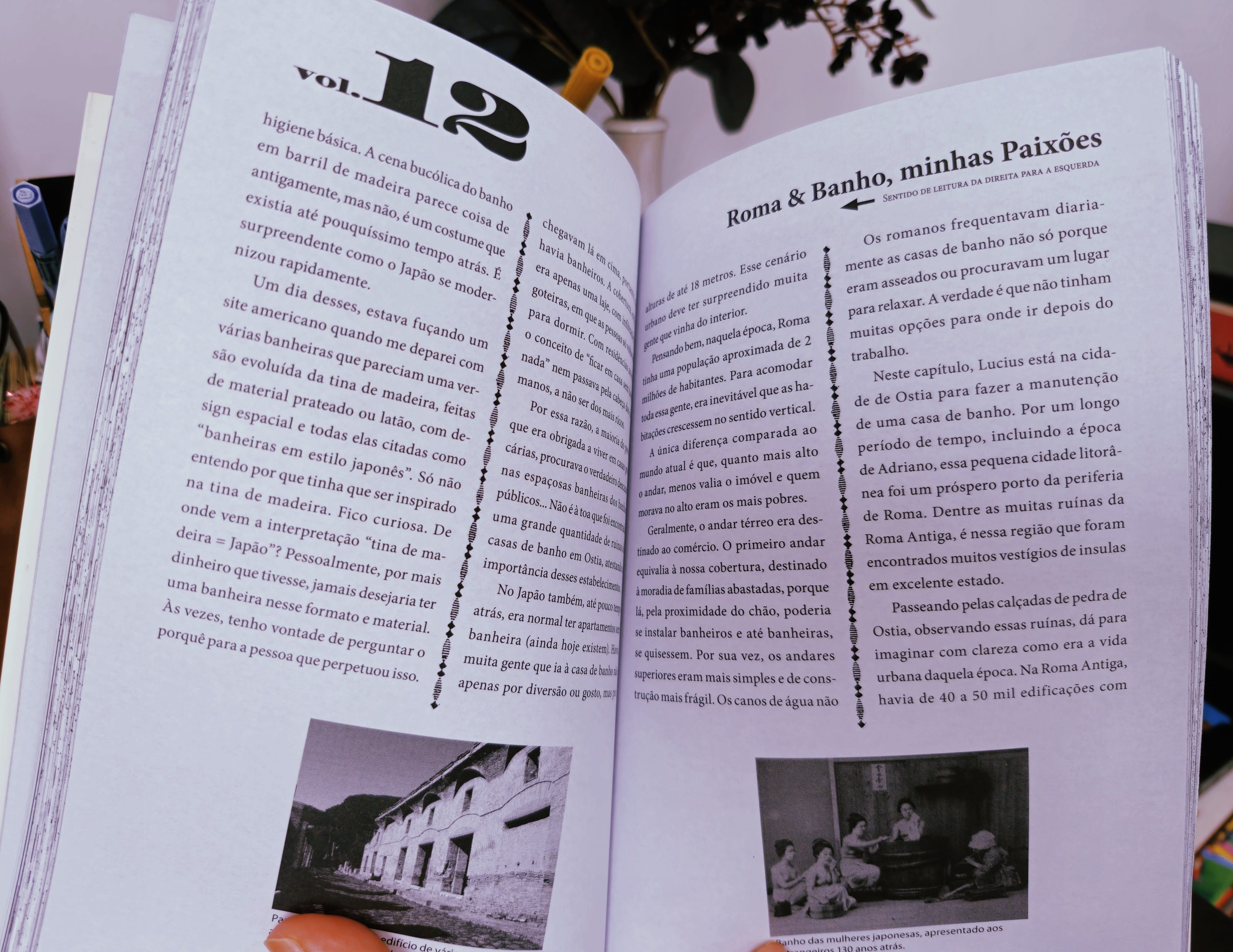 No primeiro volume, o pessoal da JBC (a editora que trouxe o mangá para o Brasil) comenta que quis apostar em uma obra diferente para o nosso país. De fato, Thermae Romae é único de diversas formas! A autora, que mora fora do país há muito tempo, fez pesquisas muito profundas para relacionar o mundo dos banhos na Roma Antiga com o do Japão. Para estreitar esses tópicos, criou uma personagem (Lucius Modestus, excelente nome) que transita entre a lendária cidade e o país do Oriente, este em tempos mais modernos.